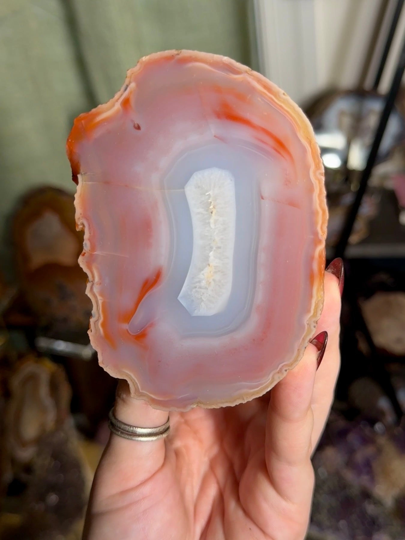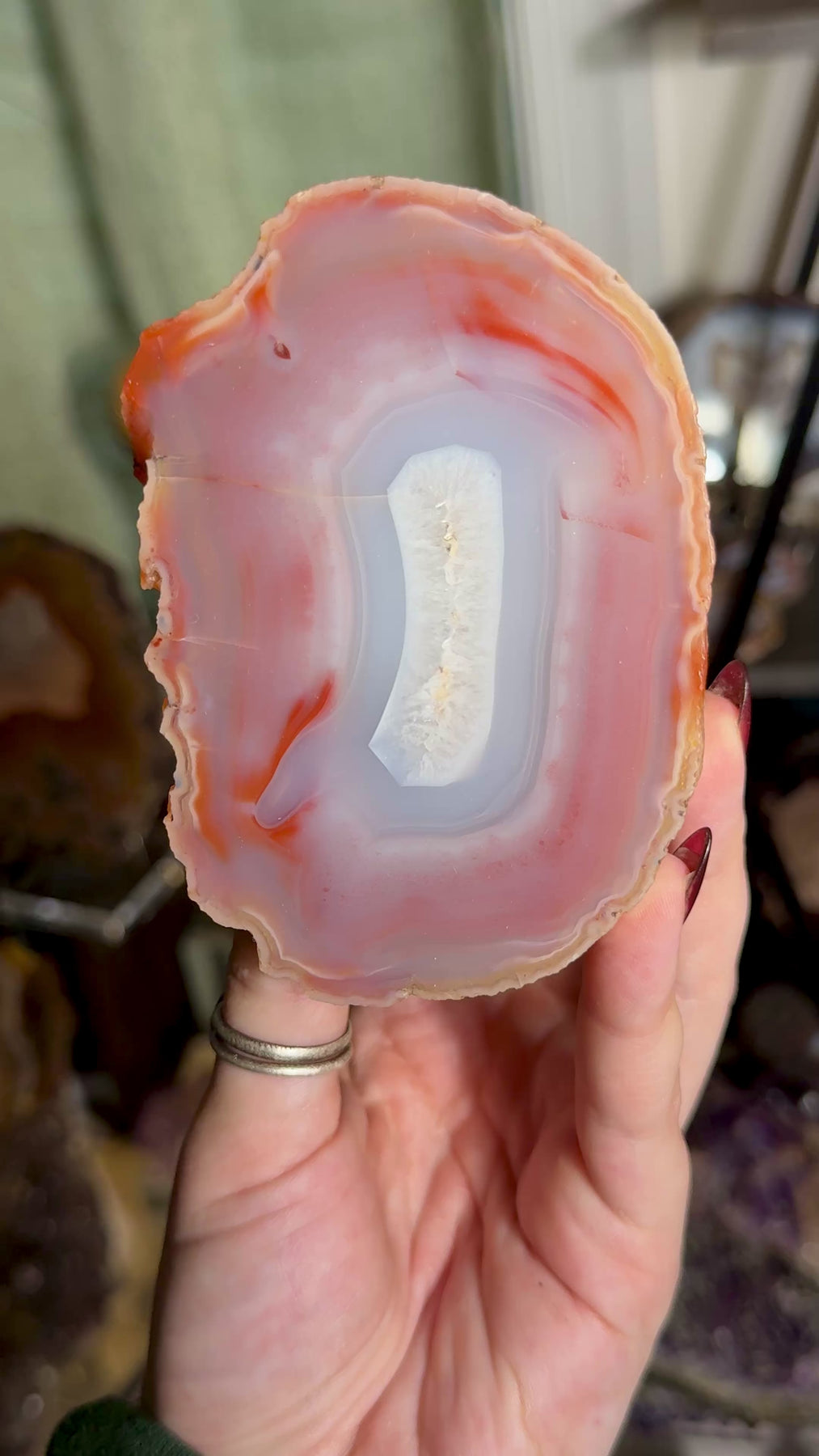 A statement Patagonia agate with soft pink washes, flowing red streaks, and a tranquil blue center, blending together like a natural watercolor. Artistic, fluid, and beautifully expressive.