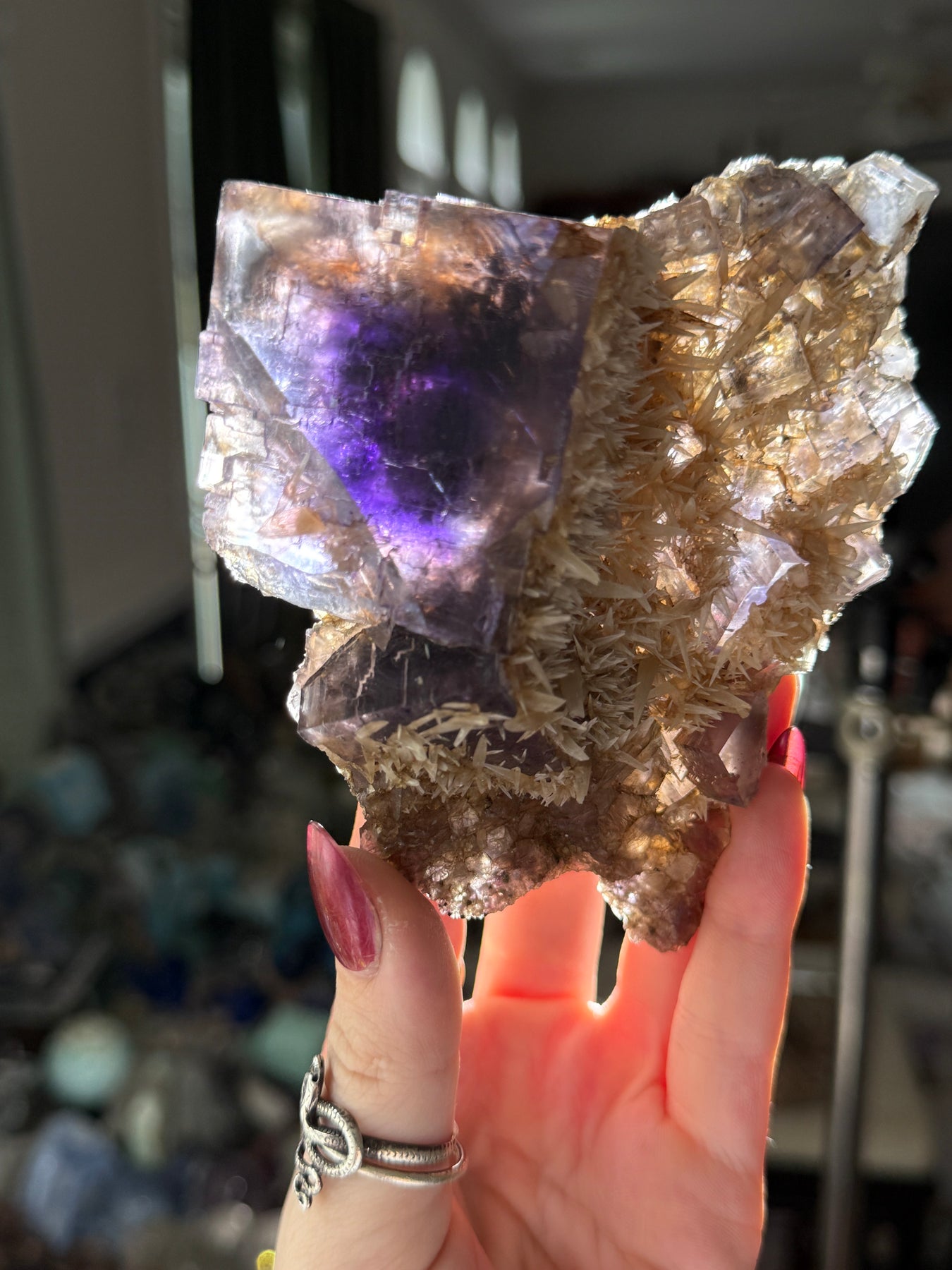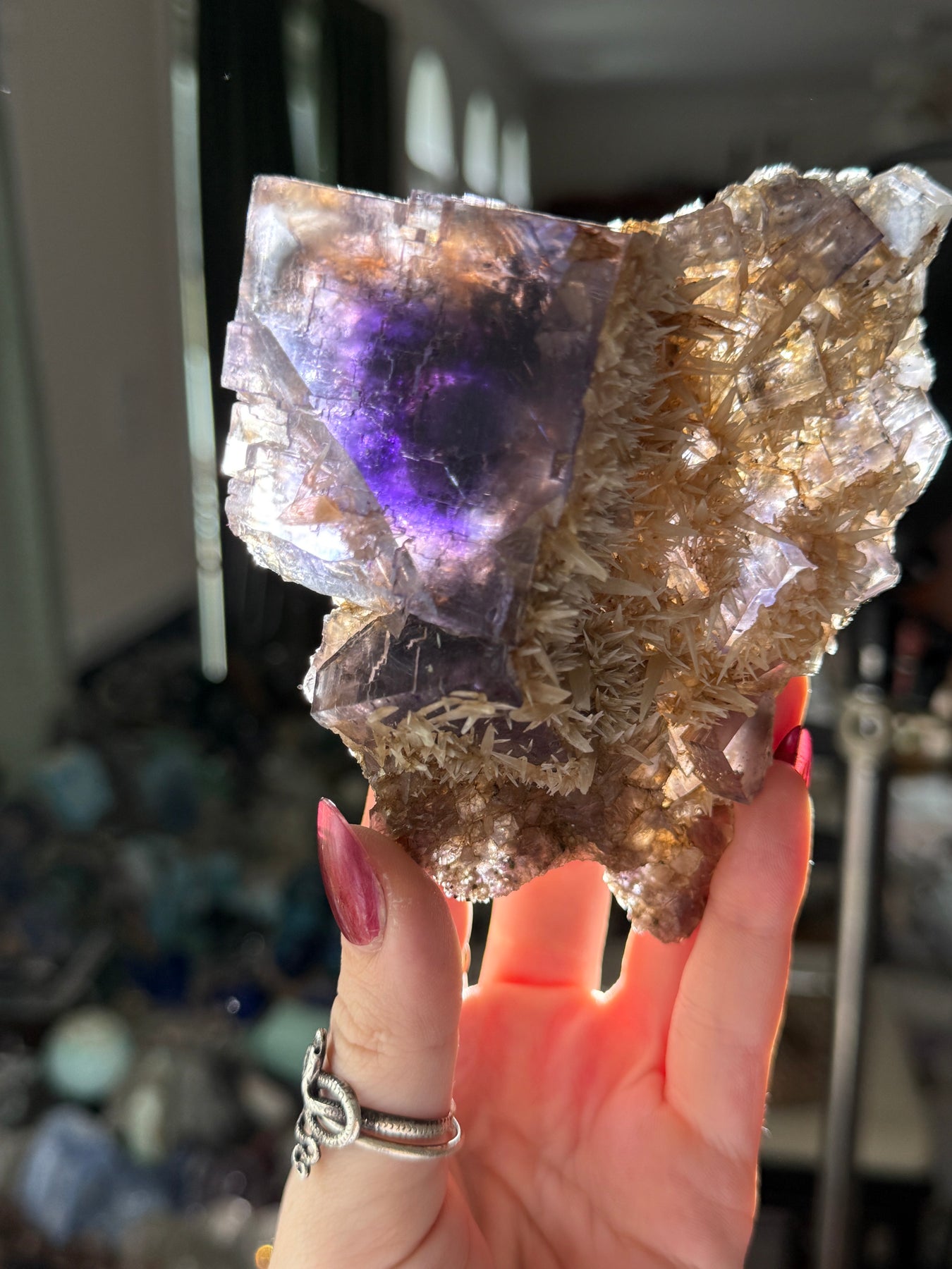 A special specimen from Minerva no.1 mine, found in the 70s. Covered in calcite points, and glowing a vibrant purple core, this is a one of a kind specimen.