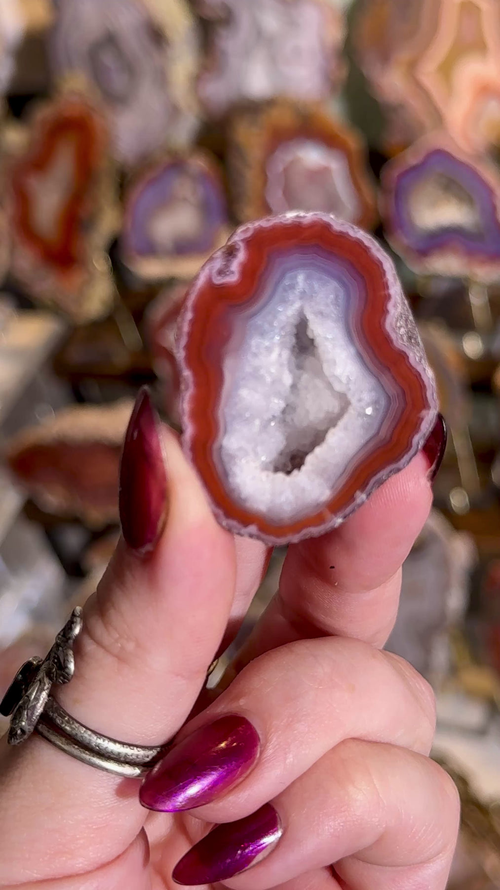 A striking Coyamito agate featuring rich purple and red tones. Known for its vibrant coloration and complex patterns, this classic Mexican agate is a stunning contrast to any collection.