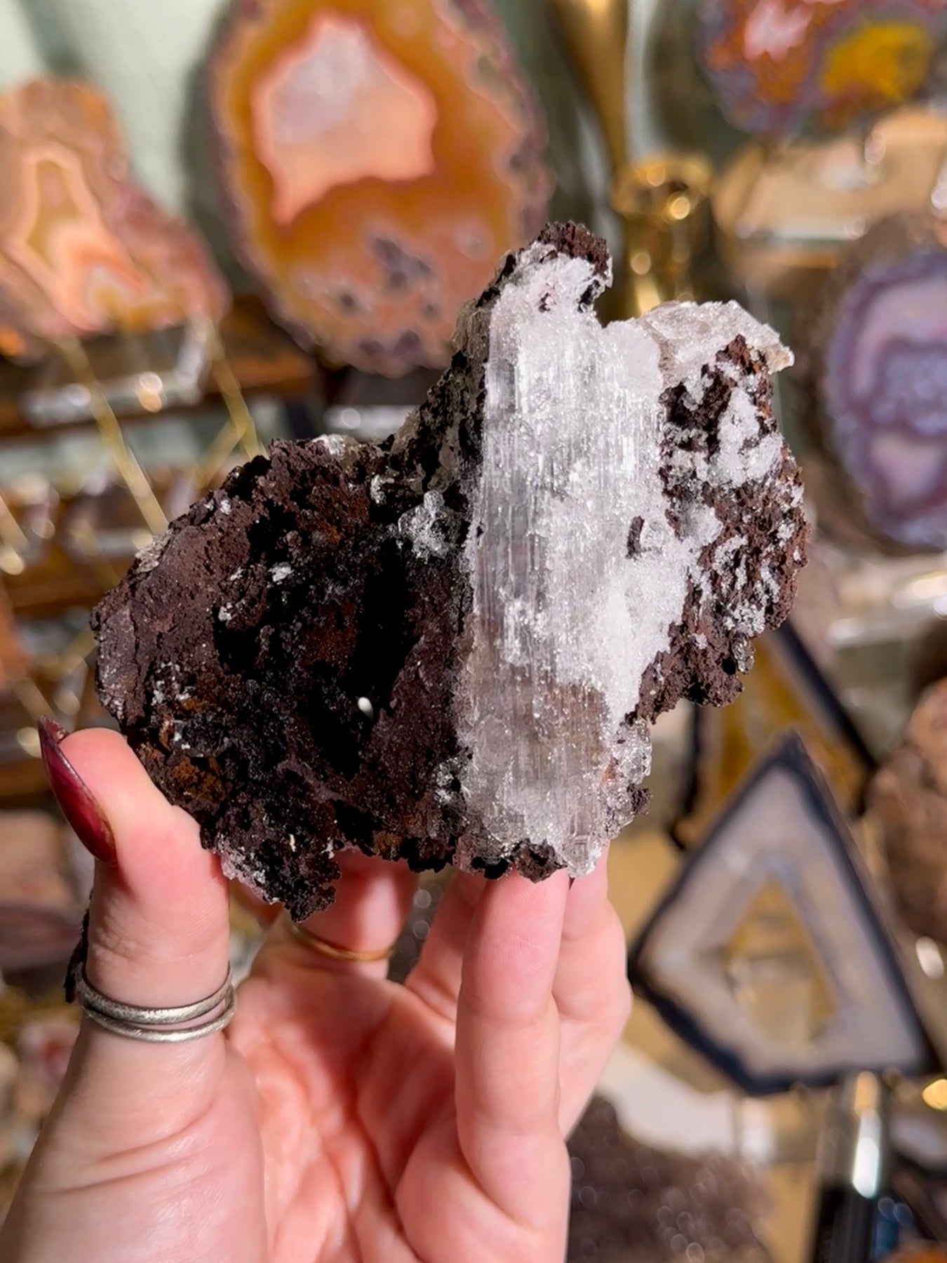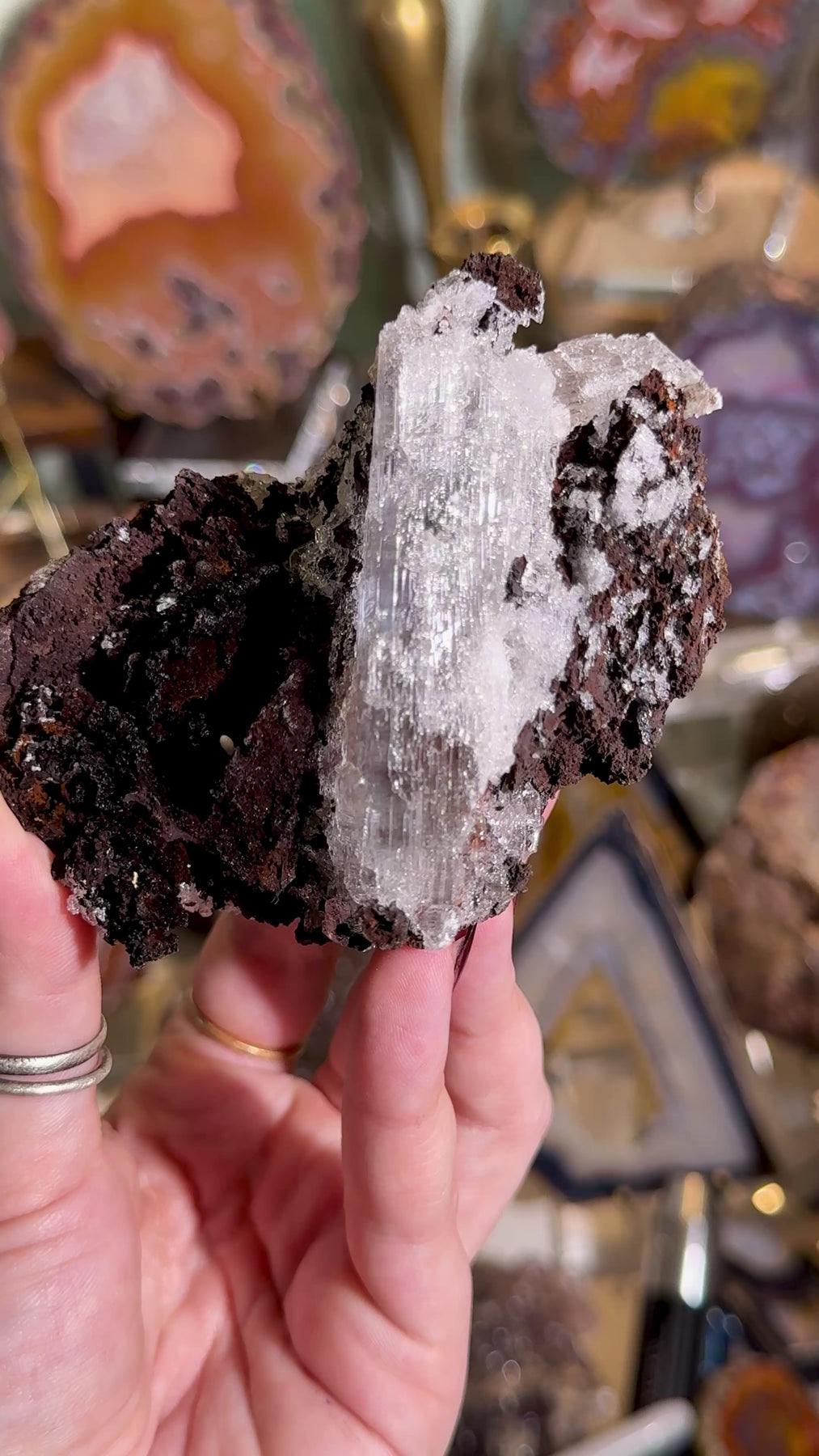 A new find of icy selenite crystals perched on dark matrix from the Potosí Mine in Mexico. Crisp, luminous crystal blades contrast beautifully against the black host rock, creating a striking and highly collectible specimen.
