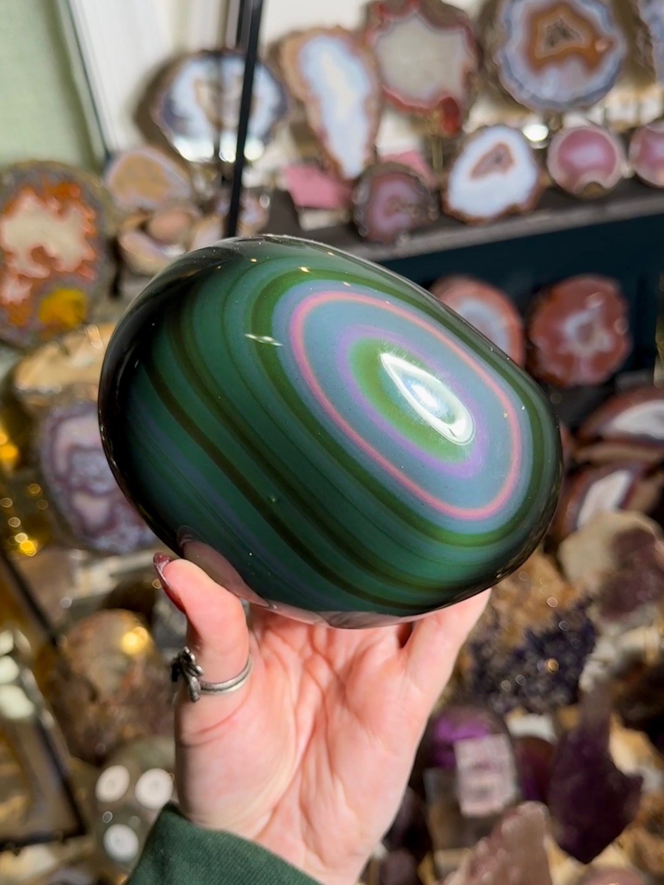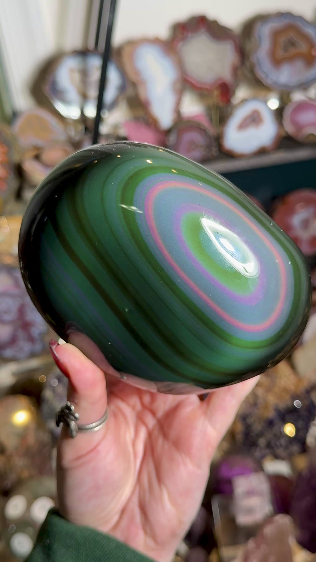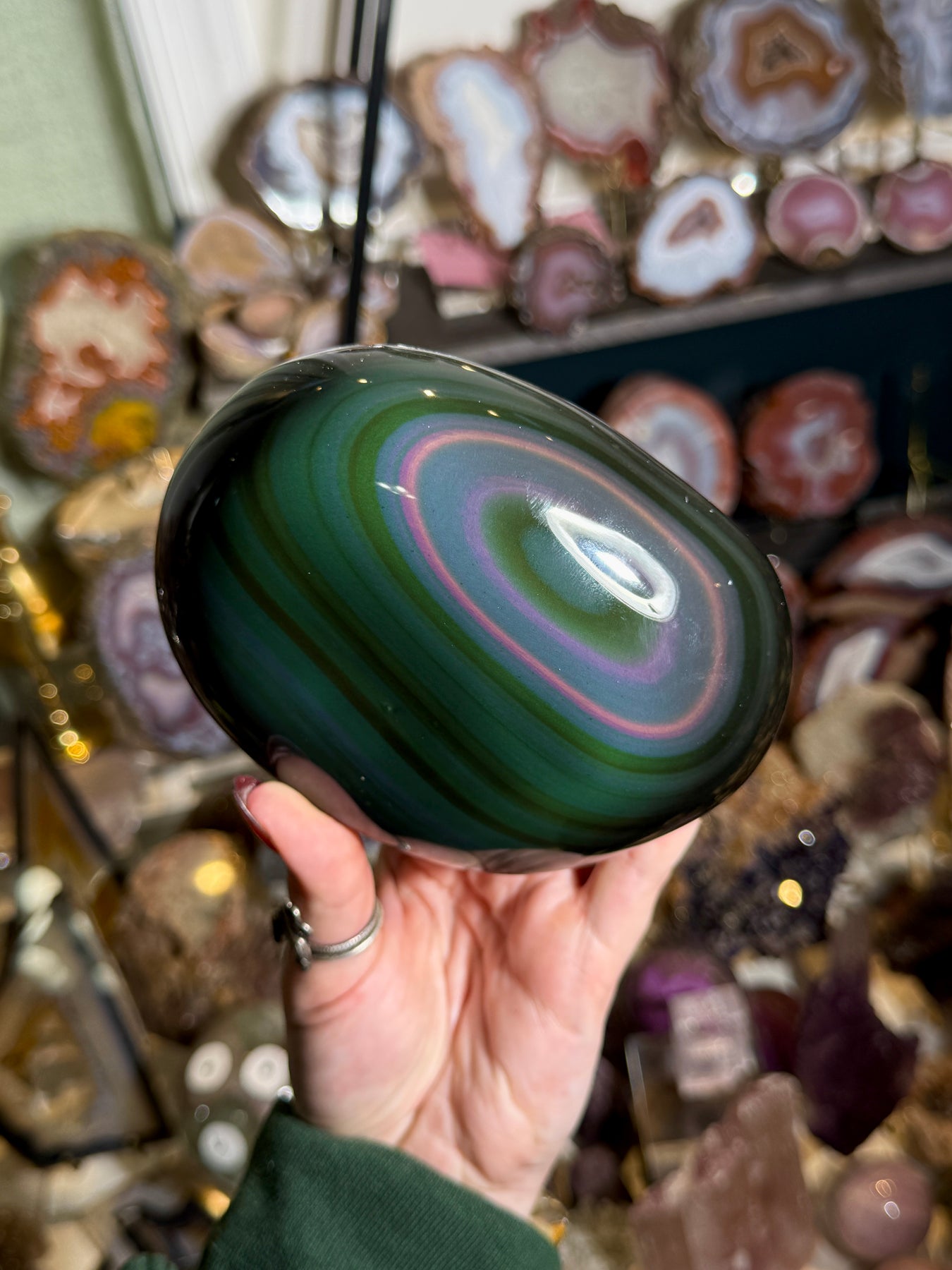 A large rainbow obsidian freeform from Mexico, glowing with subtle iridescent flashes across its glossy black surface.