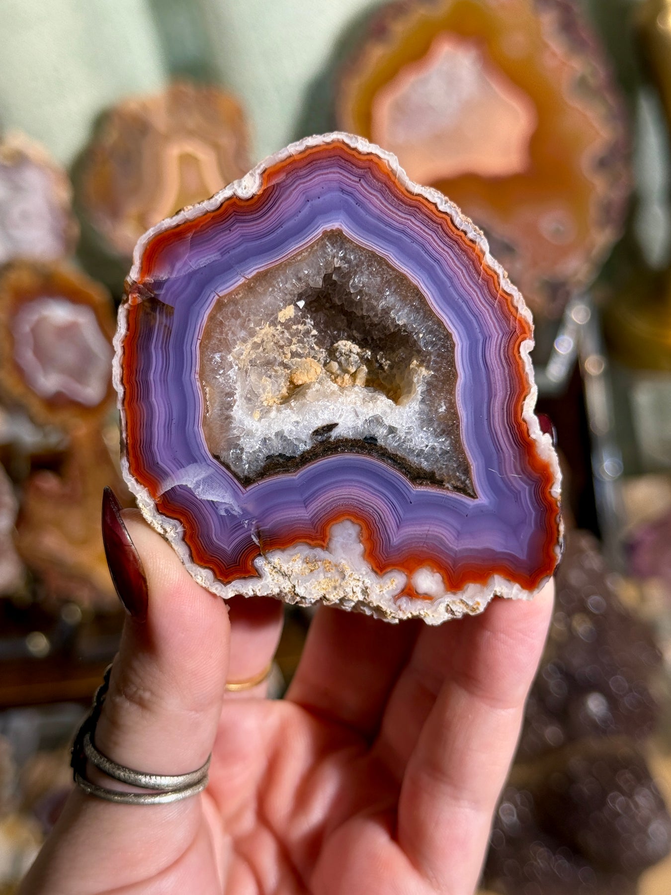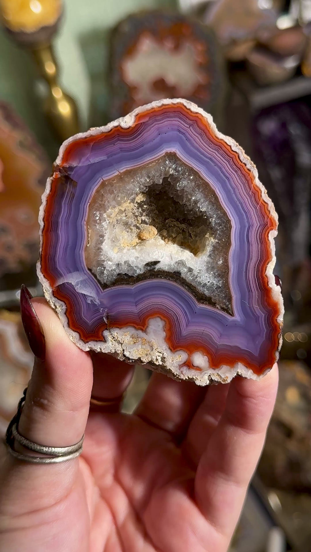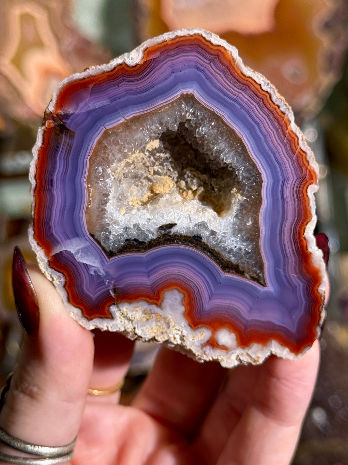 An exceptional, top-tier Coyamito agate featuring saturated deep purple and rich red hues with intricate, high-contrast natural patterning. A standout collector specimen from one of Mexico’s most celebrated agate localities.