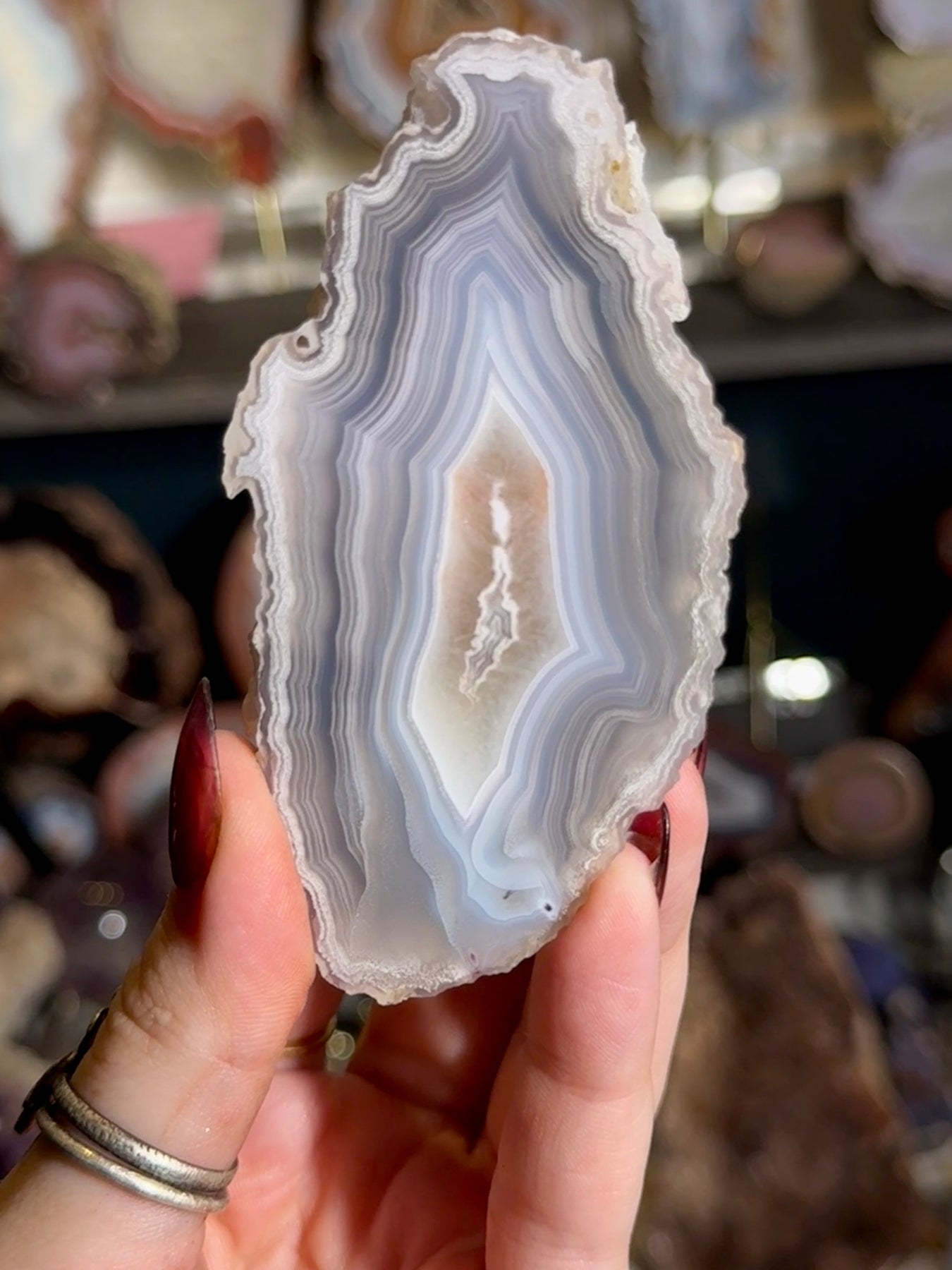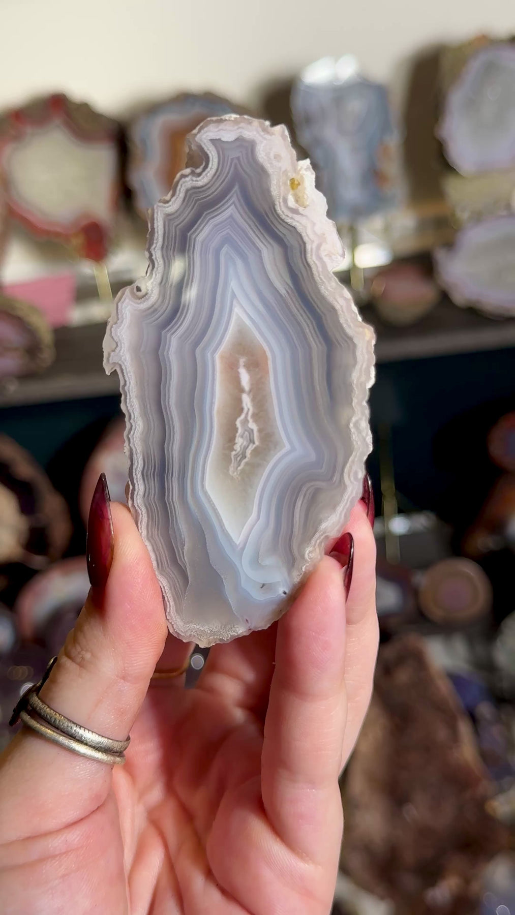 A refined Laguna agate displaying soft blue and cool gray tones with crisp, natural banding characteristic of this classic locality.