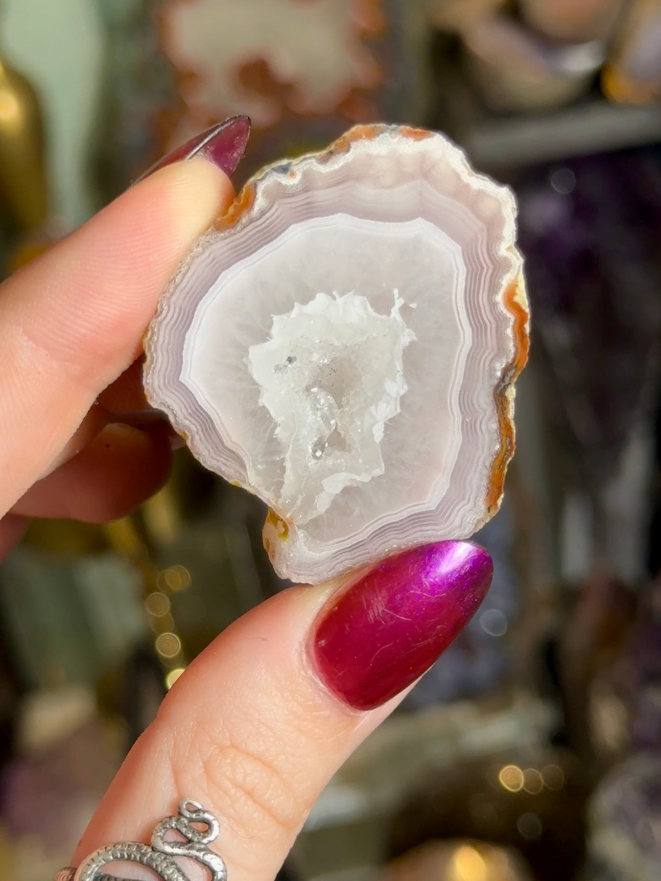 A delicate light pink Laguna agate accented by a sparkling druzy quartz center. Soft coloration paired with natural crystal texture makes this a refined and eye-catching example from this classic locality.