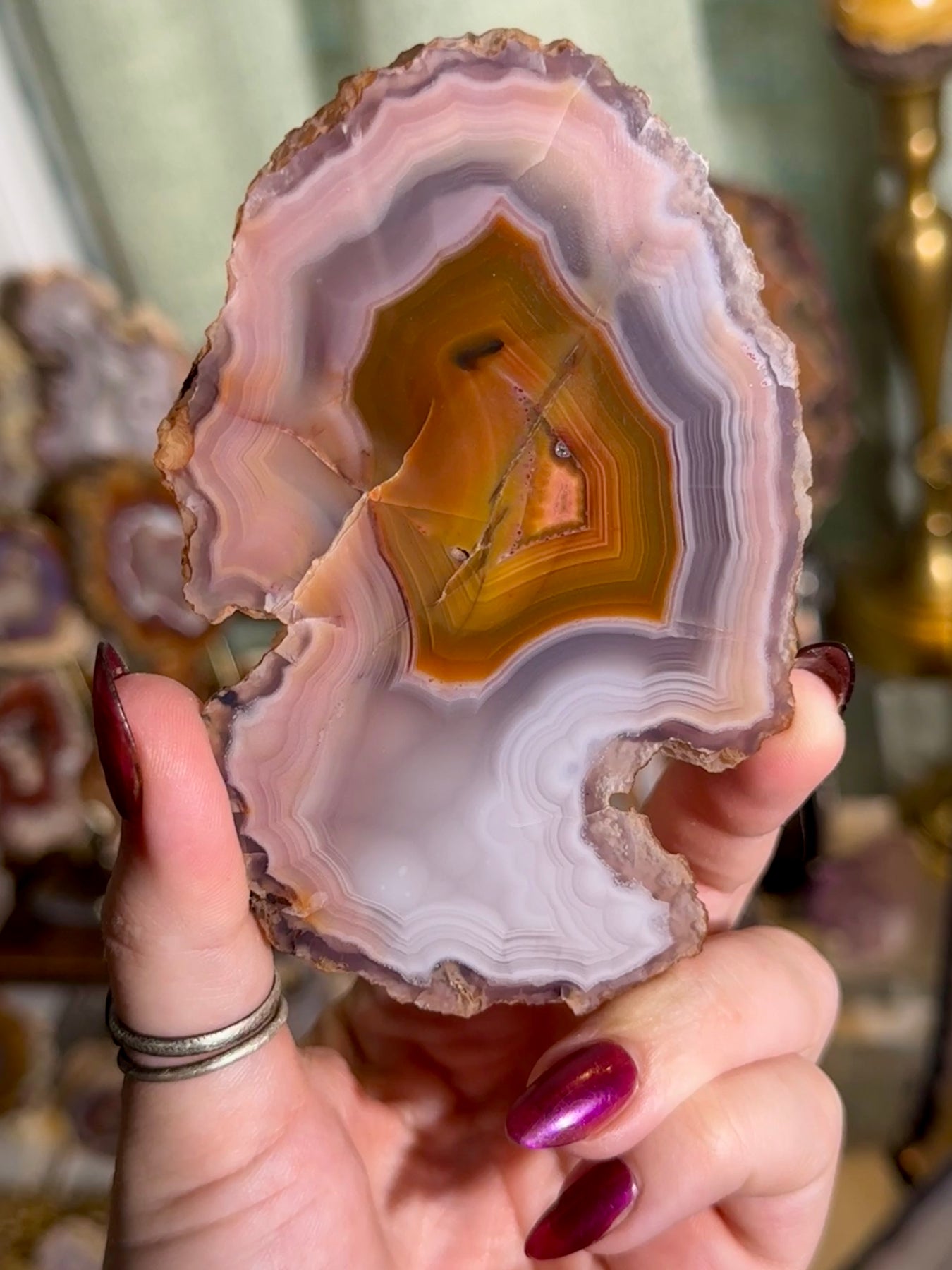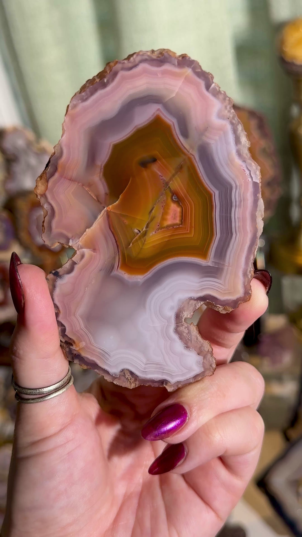 A beautifully sliced Laguna agate featuring soft pink, purple, and orange tones with a gently clouded, ethereal banding pattern. An elegant and soothing colorway from this classic Mexican locality.