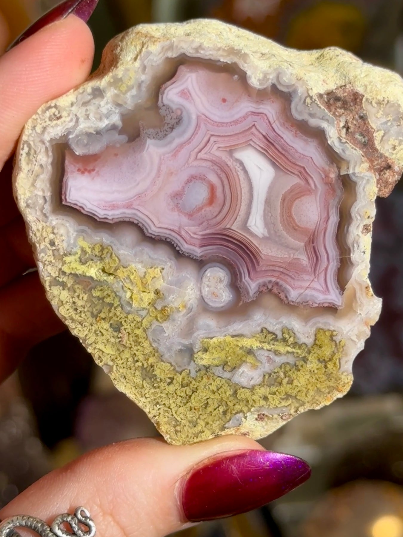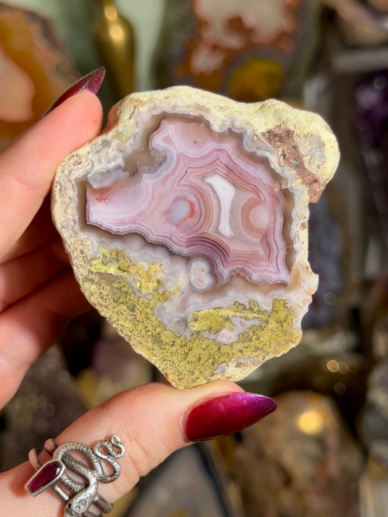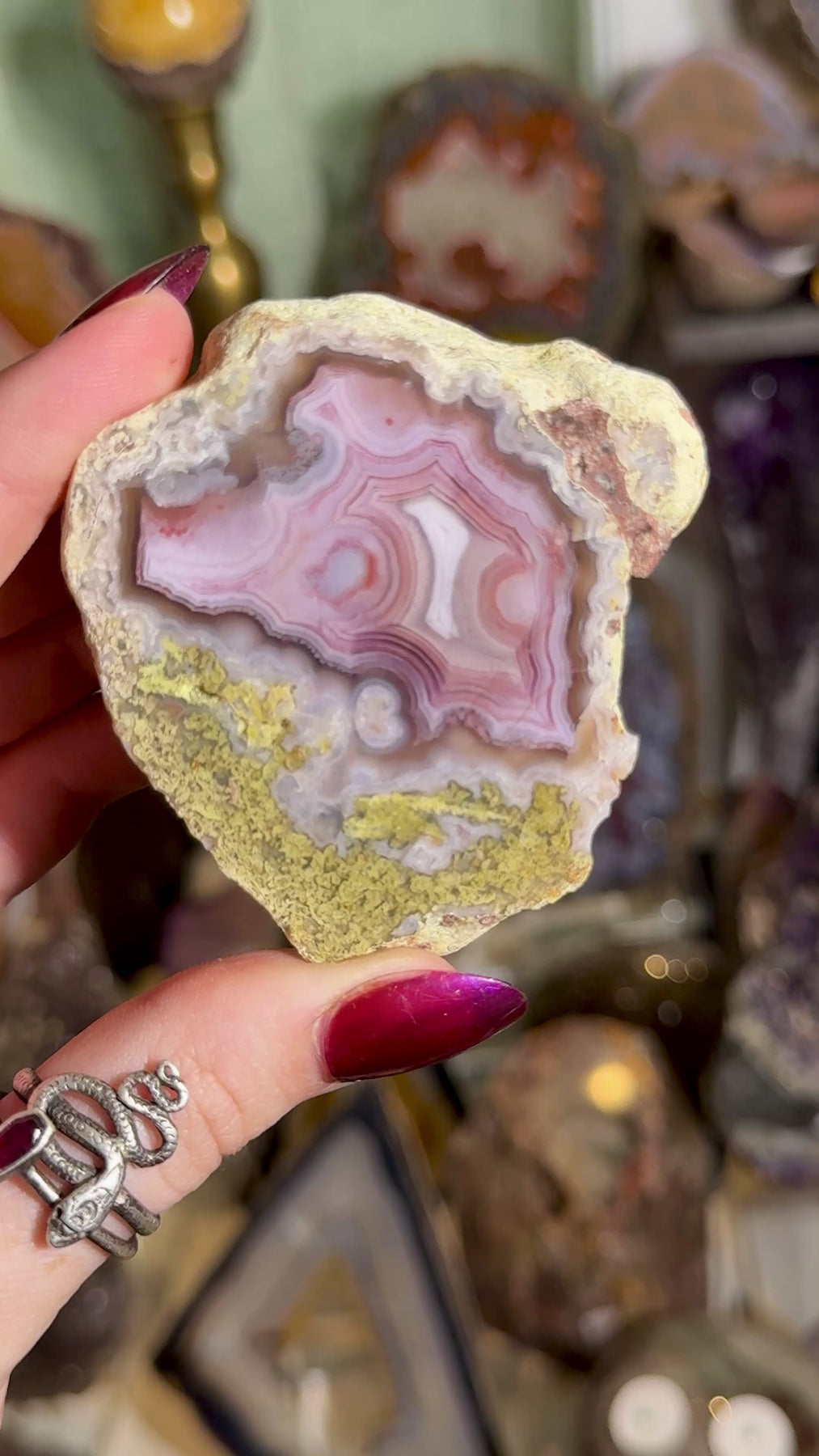 A delicate pink Laguna agate accented by soft green moss inclusions, creating gentle contrast and organic depth. A serene and unique example from this classic Mexican locality.