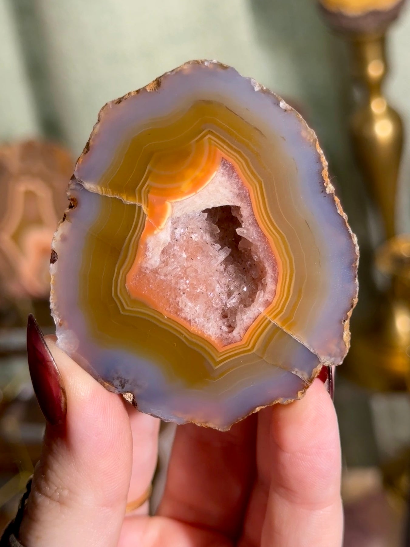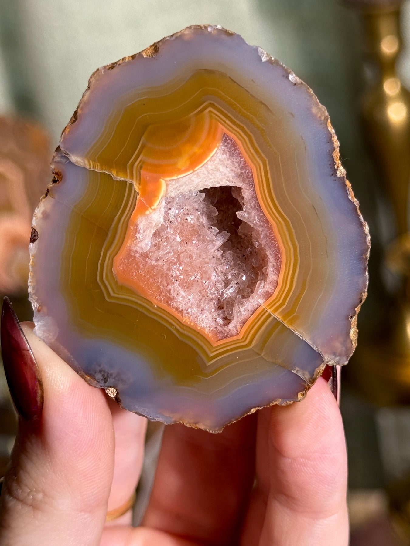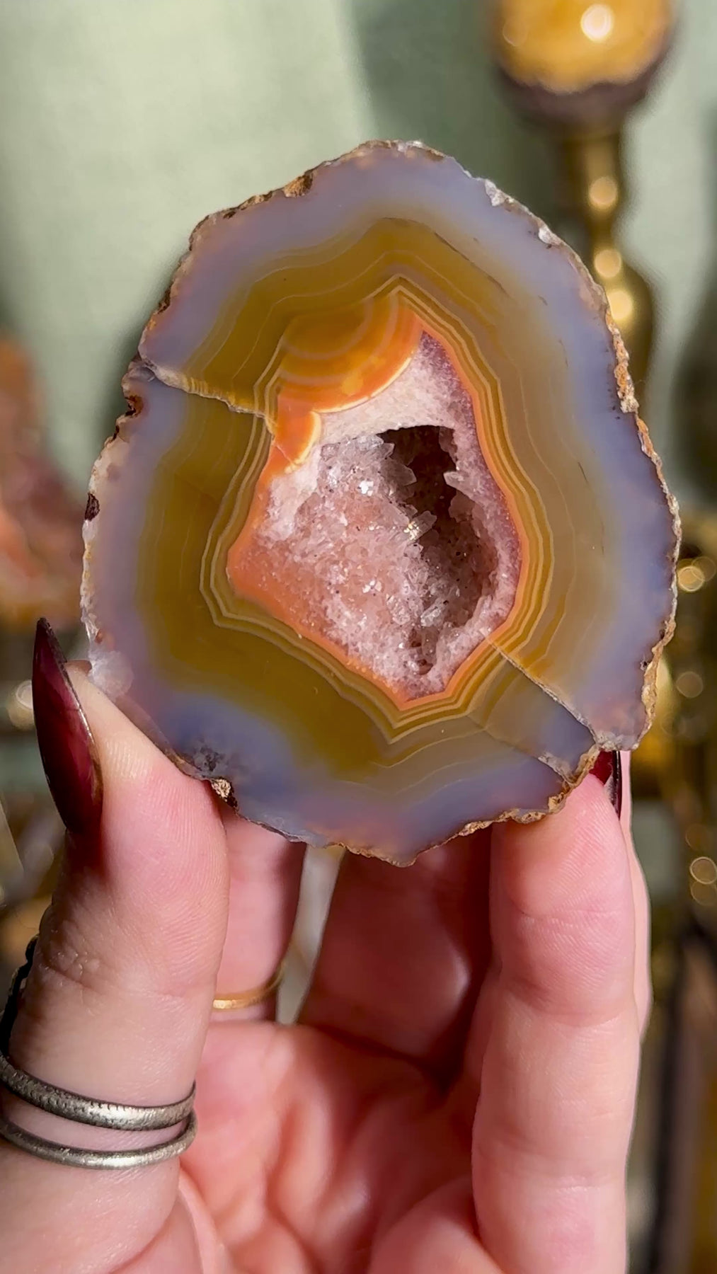 A vibrant Moctezuma agate displaying blue, green, and orange tones accented by a natural quartz center. Known for its rich color combinations and striking patterns, this piece is a beautiful example from this sought-after Mexican locality.
