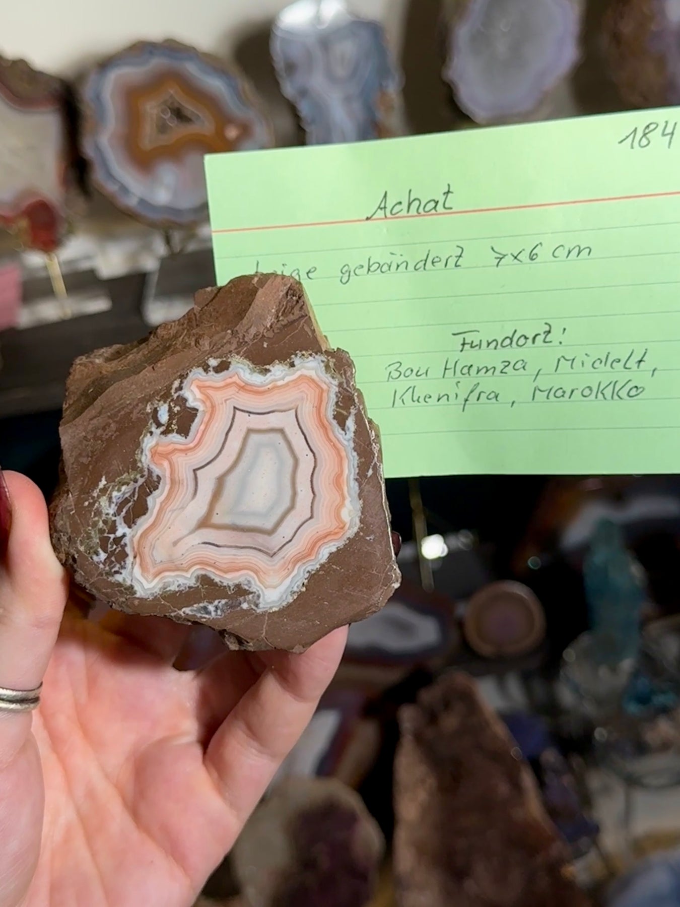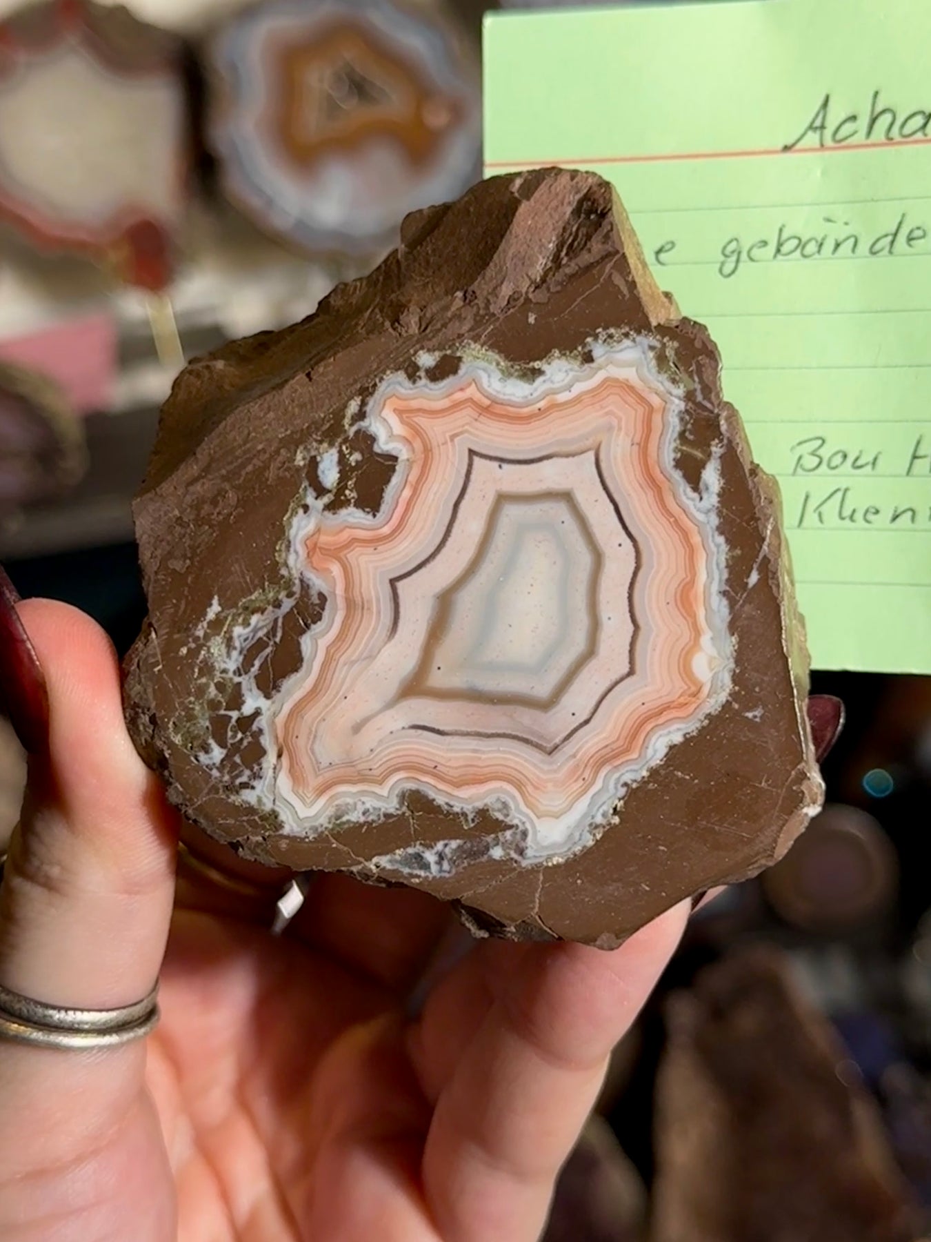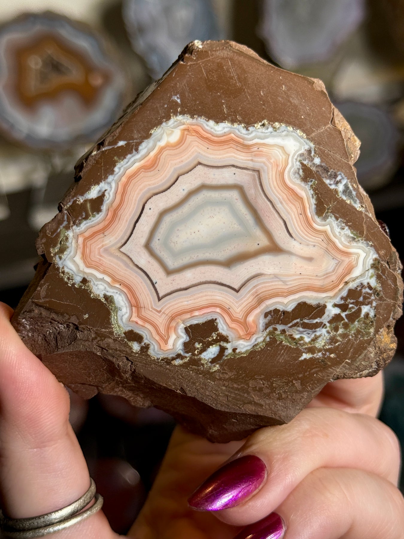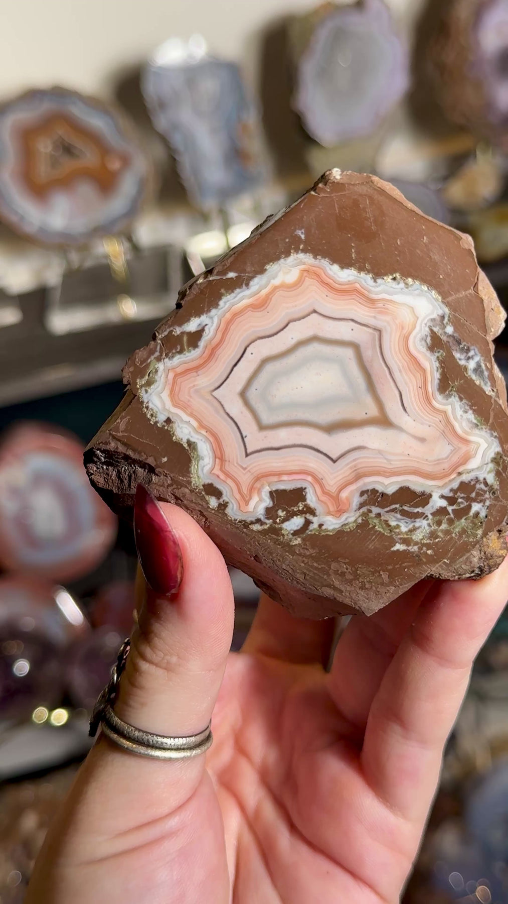 A peach-toned old stock Moroccan agate from Bou Hamza, prized for its soft coloration, fine detail, and classic material no longer commonly available.
