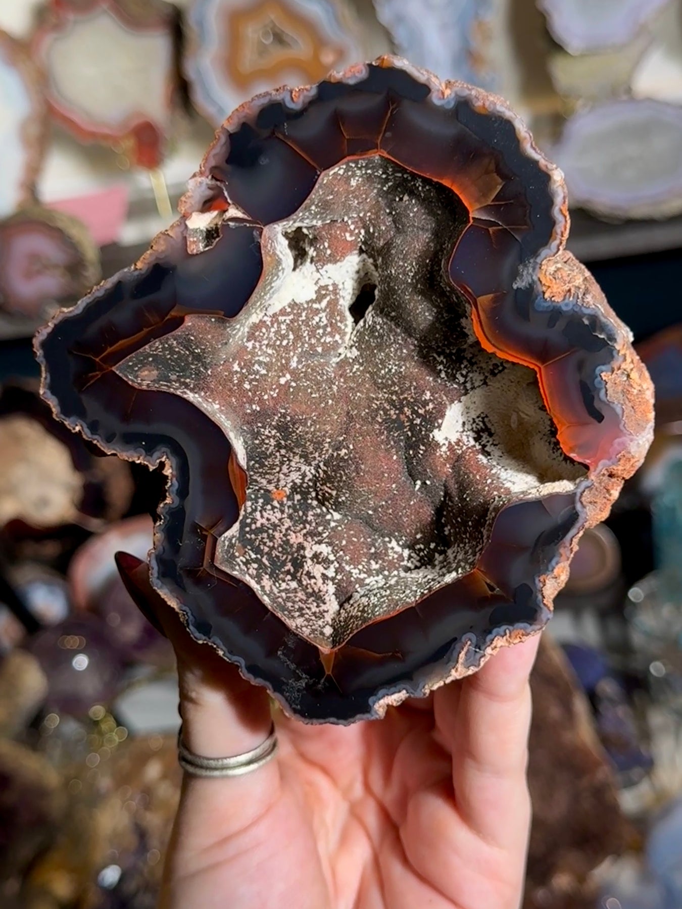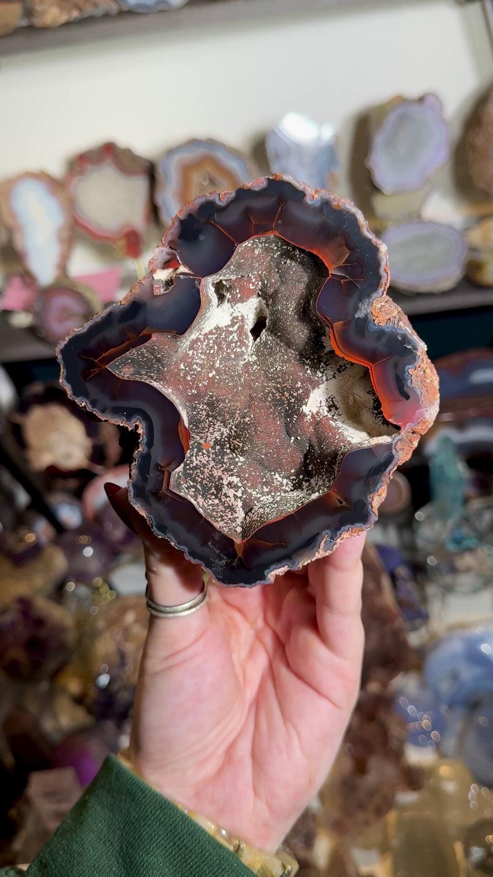 A rare and large Red Fox agate from the Valle de Las Plumas region of Patagonia, Argentina, known for its volcanic origin and distinctive red hematite-rich banding set against smoky chalcedony. Exceptionally intricate and collector-worthy from this limited quarry locality.