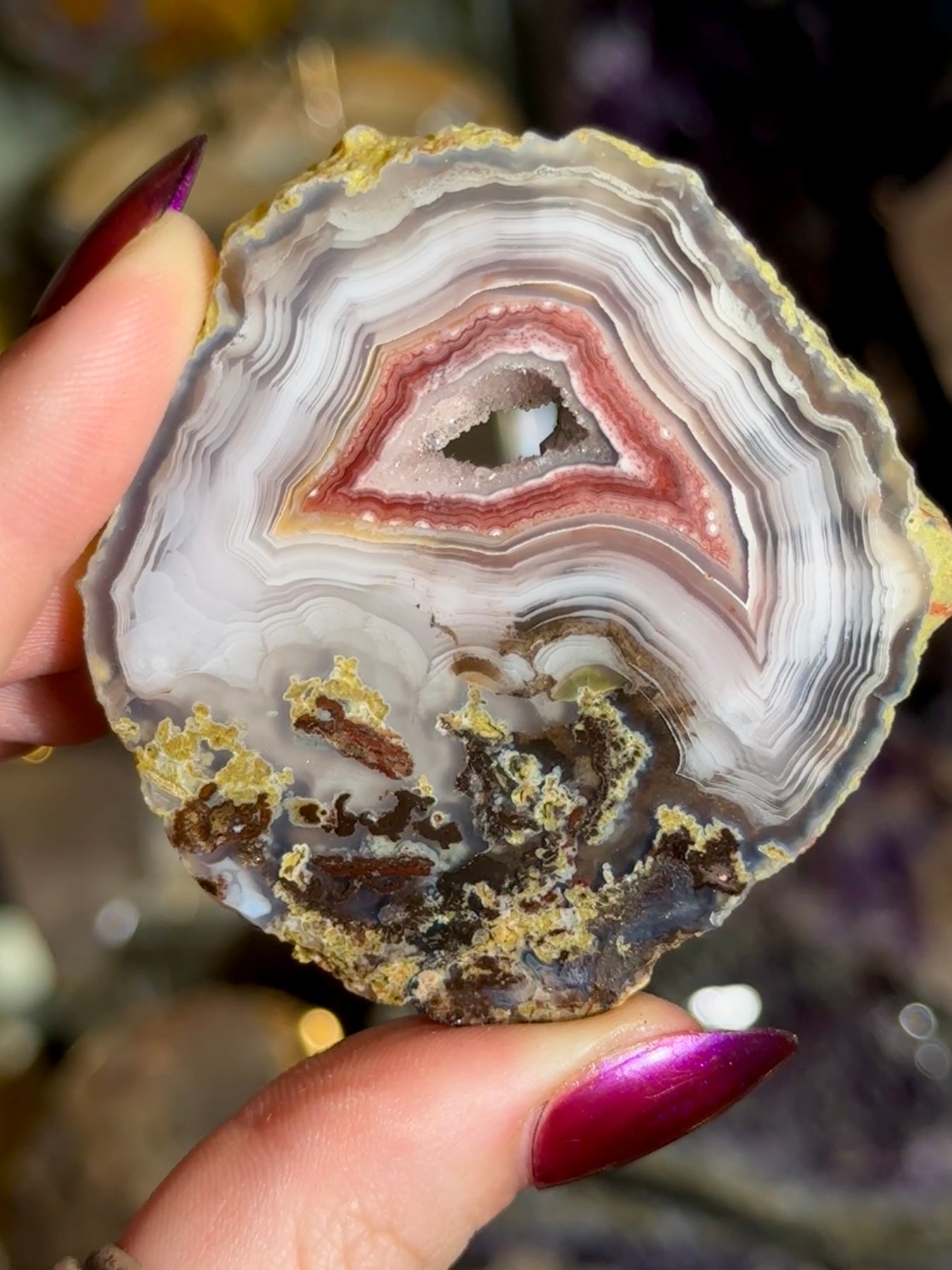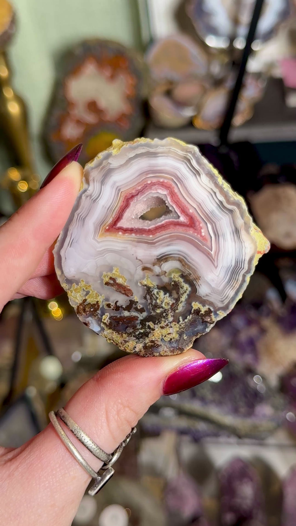 A striking Laguna agate slice featuring soft green moss inclusions, creamy white outer banding, and vivid red banding concentrated toward the center. A beautifully layered and naturally balanced example from this classic Mexican locality.