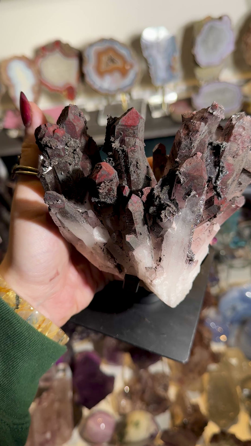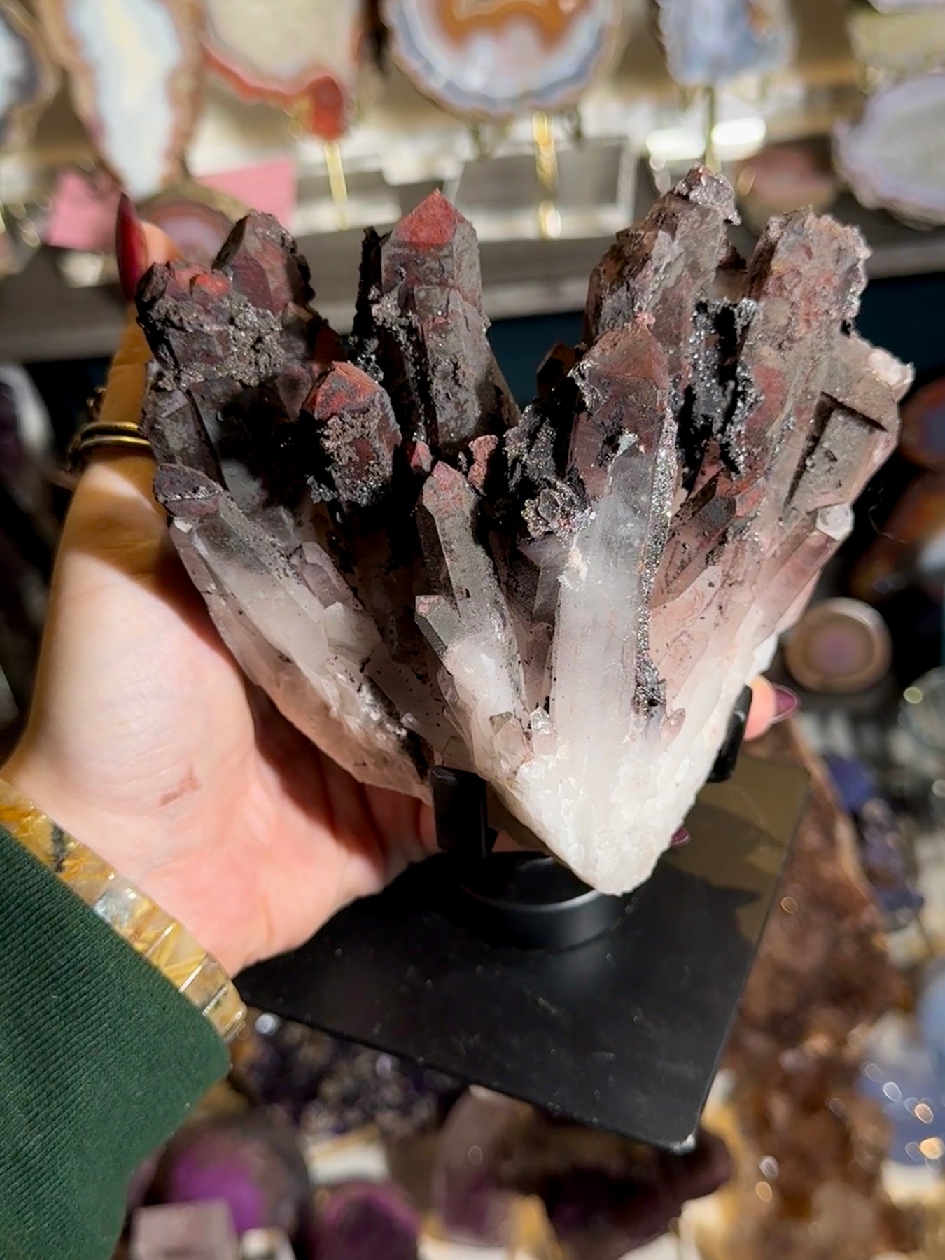 A striking sparkly red dragon quartz from Brazil, featuring dramatic hematite-rich inclusions that create fiery internal contrast, displayed on a custom-made spinning stand to highlight its presence.