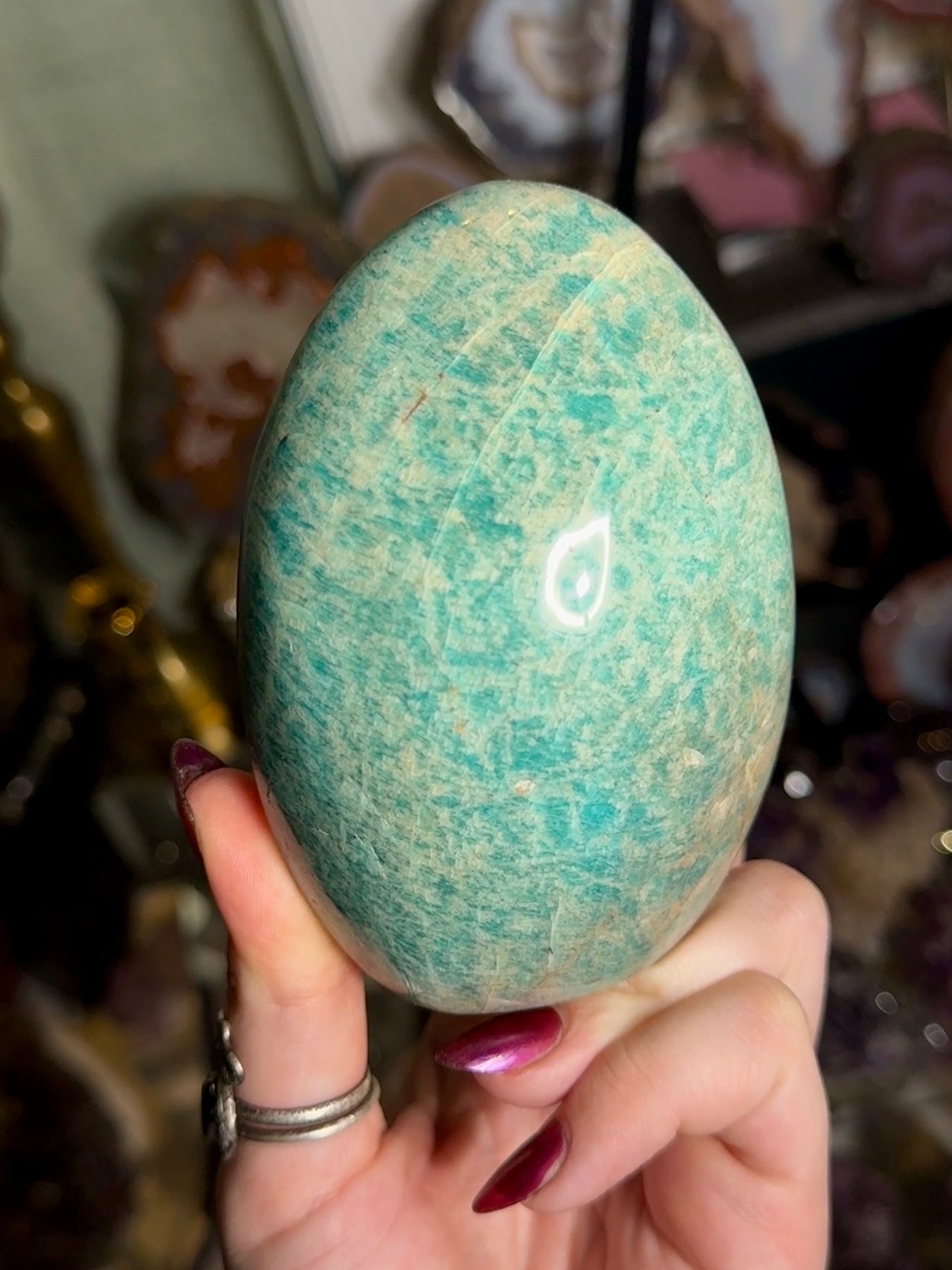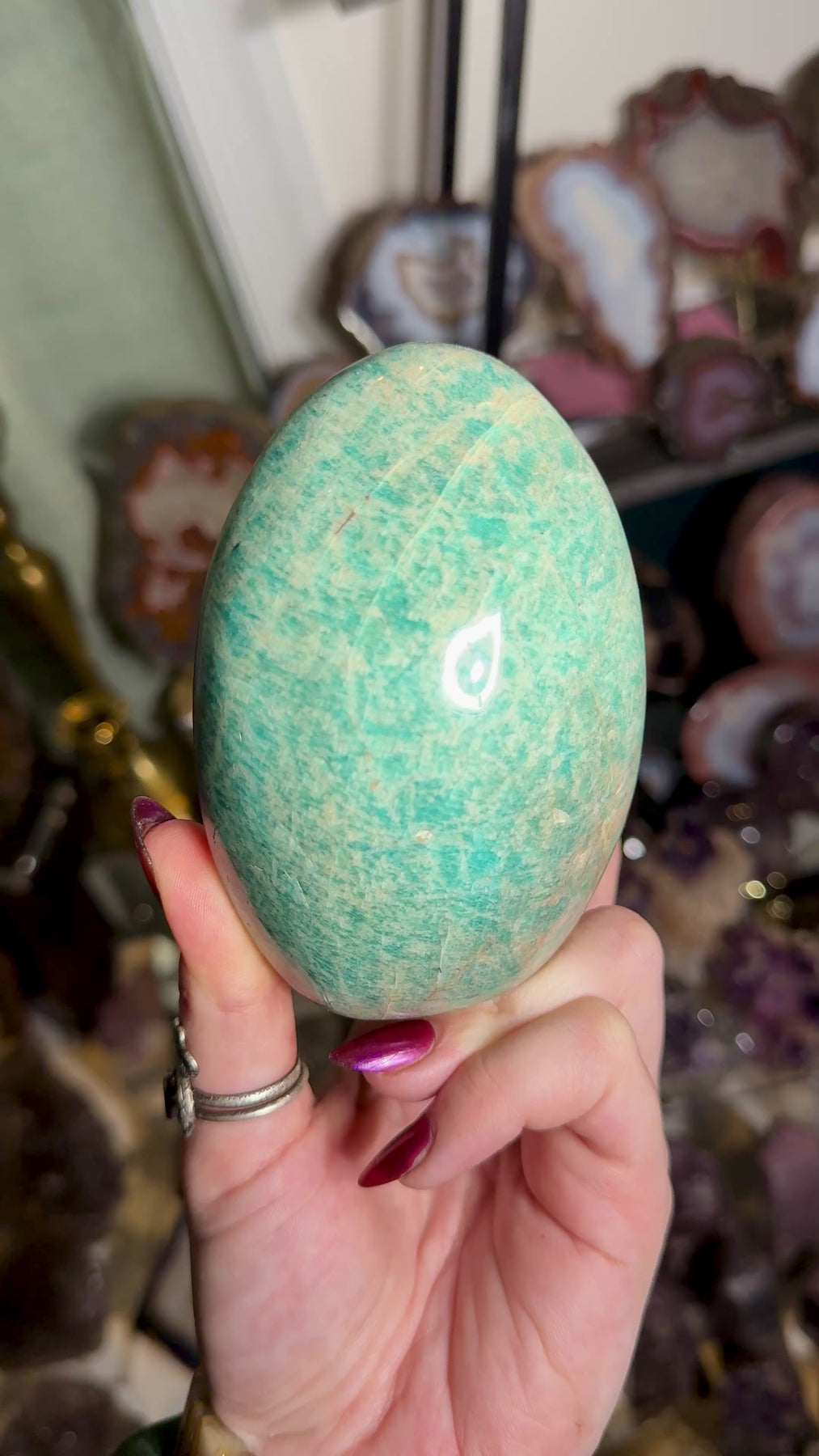 An ethereal amazonite freeform from Madagascar, glowing with soft blue-green tones and shimmering natural flash