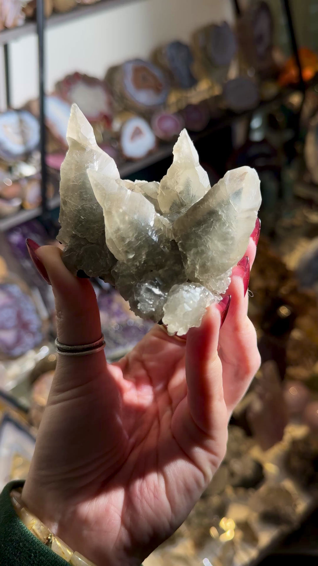 A striking statement calcite specimen from the renowned Brushy Creek Mine, featuring sharp reverse scepter formation with chalcopyrite phantoms, accented by shimmering chalcopyrite glitter at the base. A cabinet sized specimen from one of the most respected calcite localities in the United States.