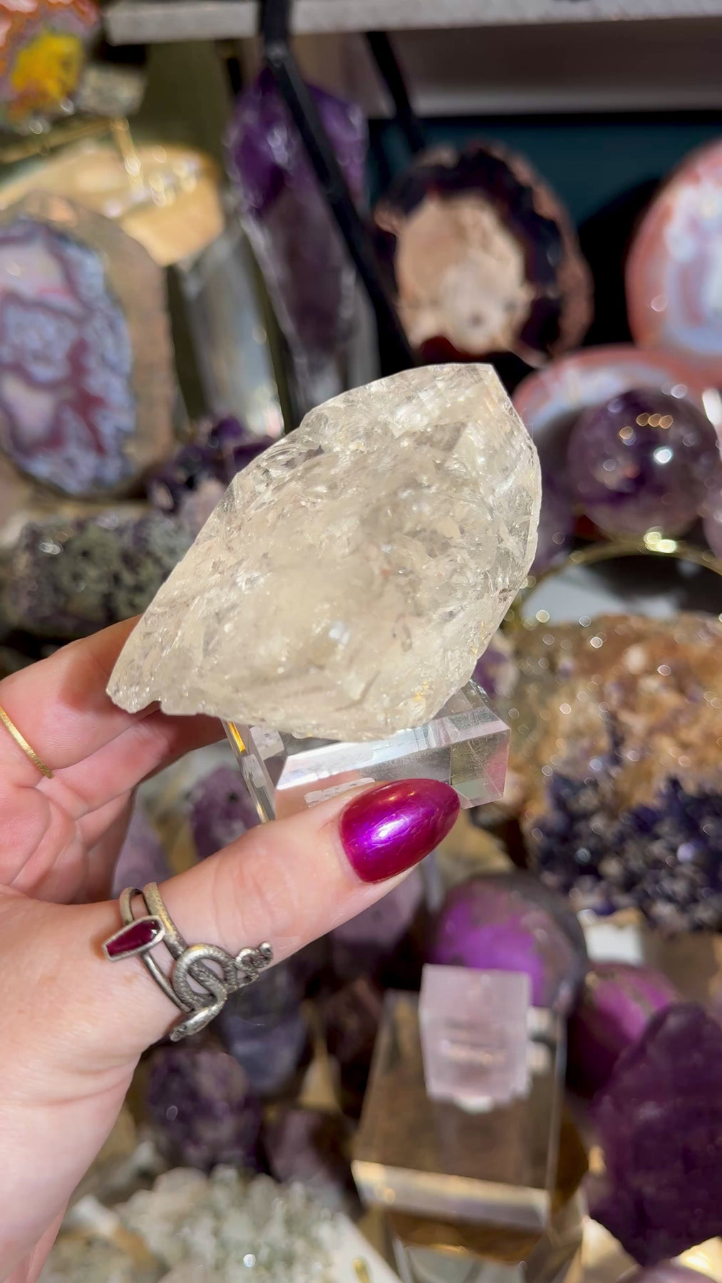 A champagne-hued topaz specimen from Medina, Minas Gerais, Brazil, displaying warm golden tones and natural clarity, with a stand to highlight its elegant form.