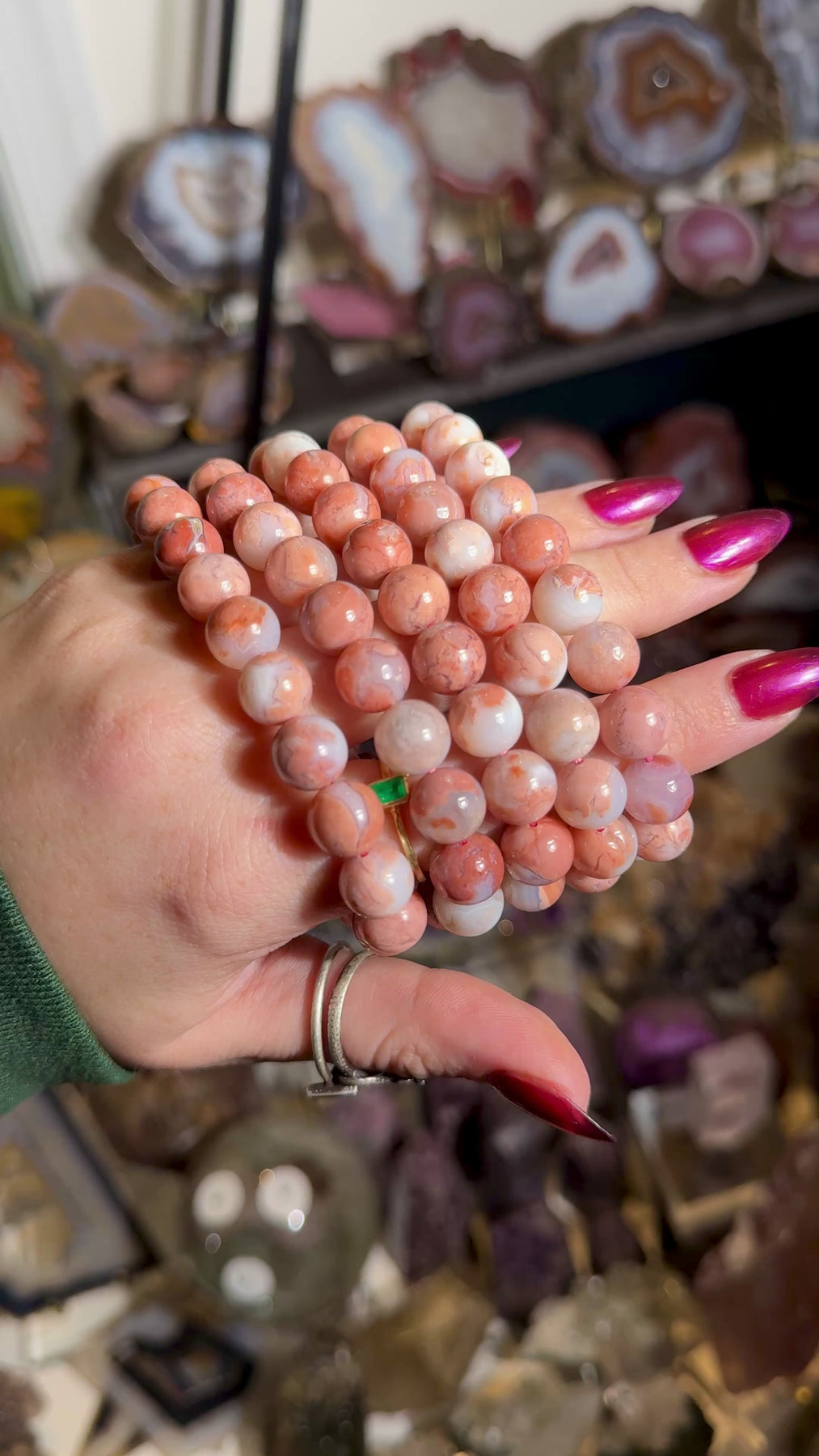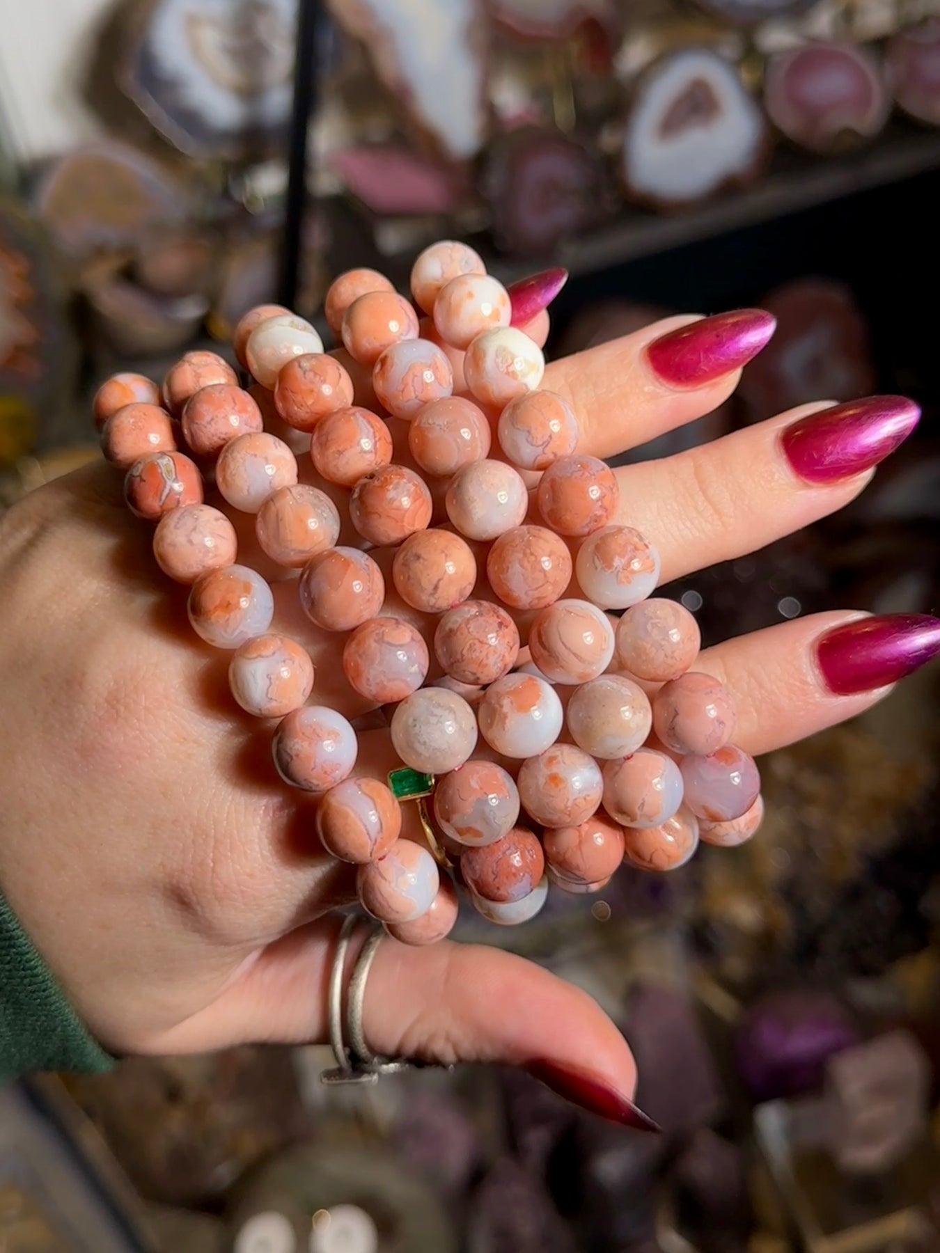 A cotton candy agate bracelet made with smooth 10mm beads, showcasing soft pastel hues and beautiful patterning