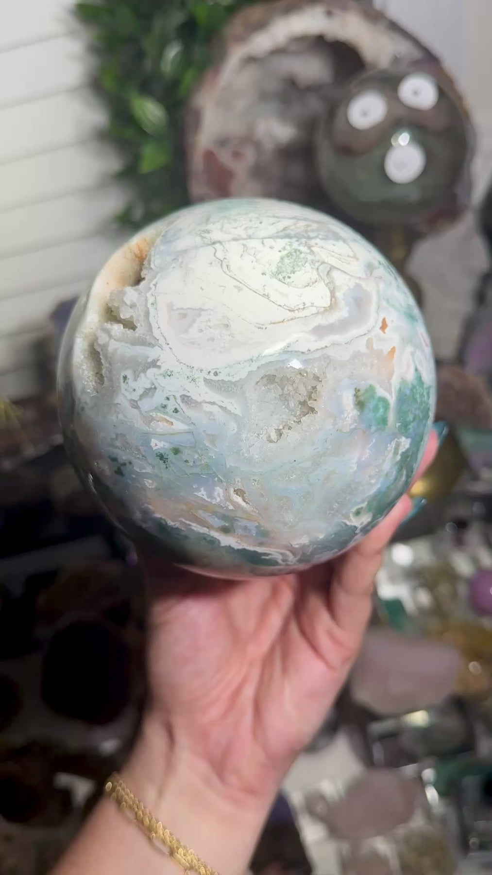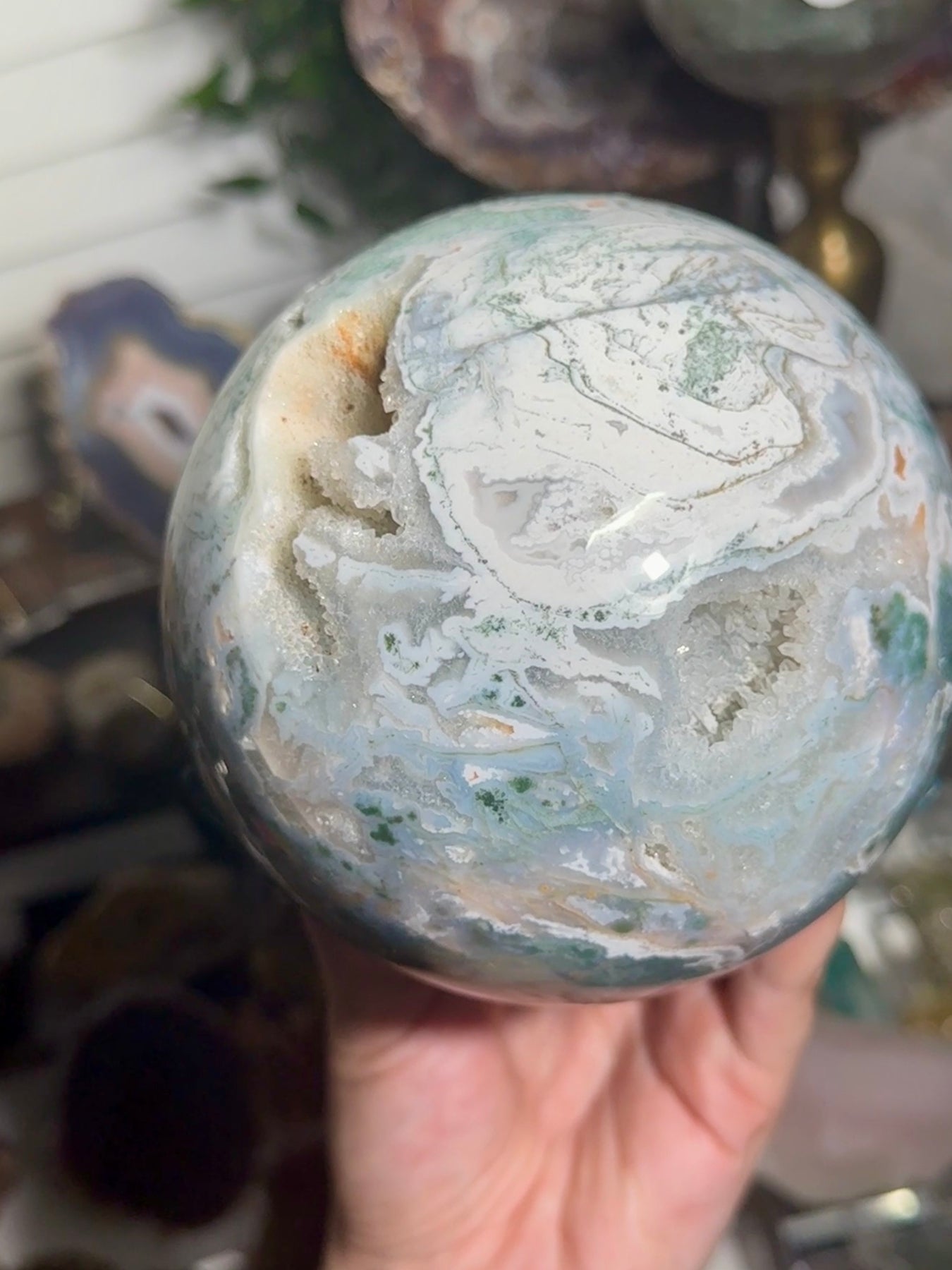 This large pink moss agate sphere is a beautiful statement piece—soft blush tones, watercolor moss inclusions, and a polished finish that glows from every angle. Sourced from India, this sphere blends dreamy feminine energy with incredible nature-like moss patterns. A breathtaking addition for collectors, decof lovers, and anyone wanting a standout piece in their crystal display.