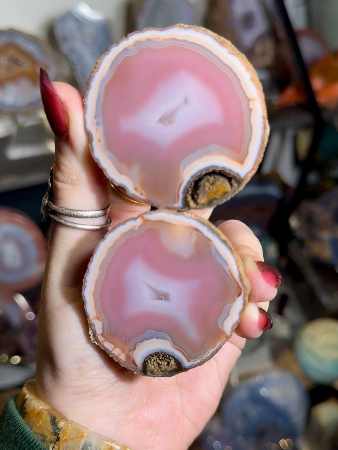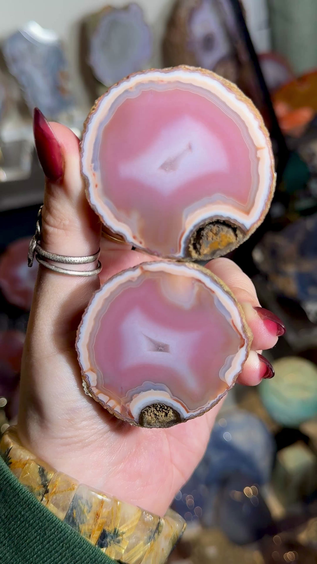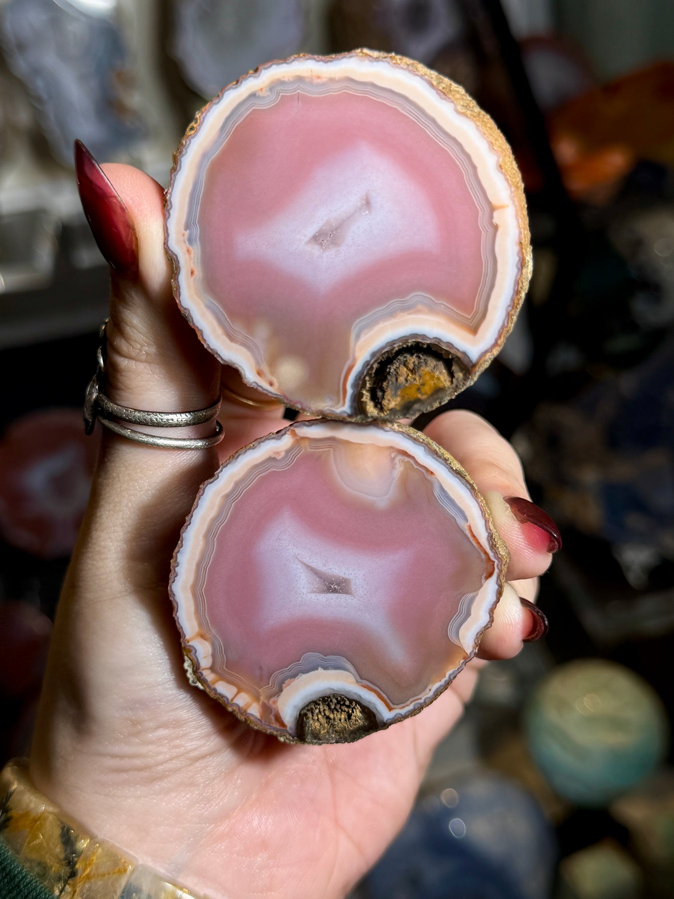 A gorgeous pink ZG agate pair, available to purchase as halves or whole.