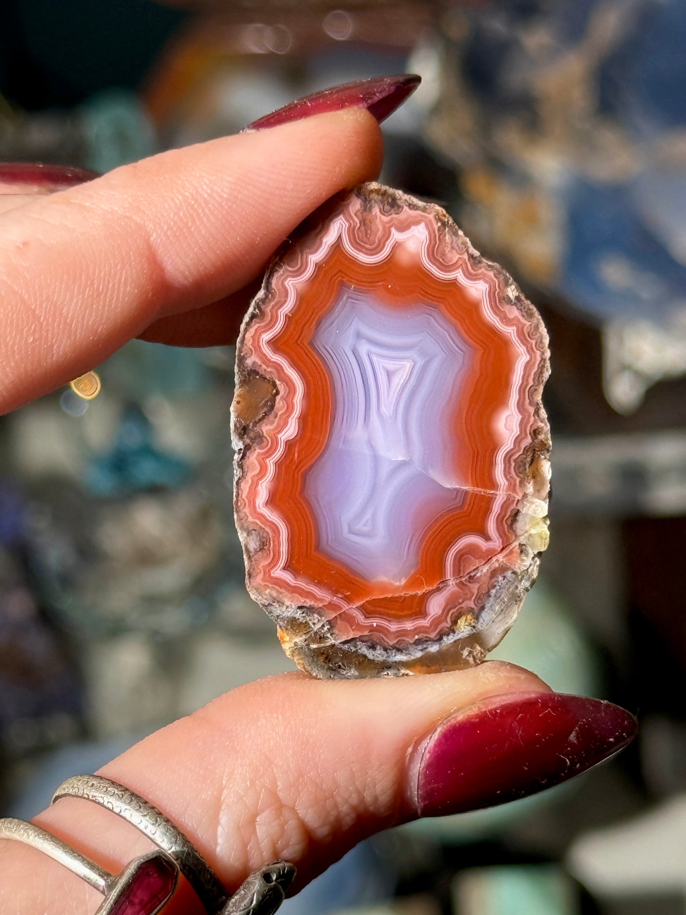 A richly colored Coyamito agate showing layered red, purple, and pink tones with classic natural patterning from this well-known Mexican locality.